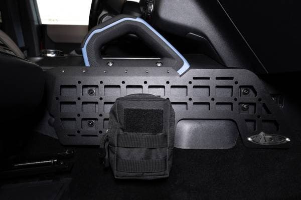Driver & Passenger Side Center Console Molle Panels; 8 PEM Nuts for 10-24 Accessory Bolts; Ram Mount Compatible; Attach Molle Bags, Med Kits, Tools, and Other Accessories; Retains Use of Passenger Side Grab Handle; Hammer Black Powder Coat; Constructed from 1/8" American Steel; Made in America.