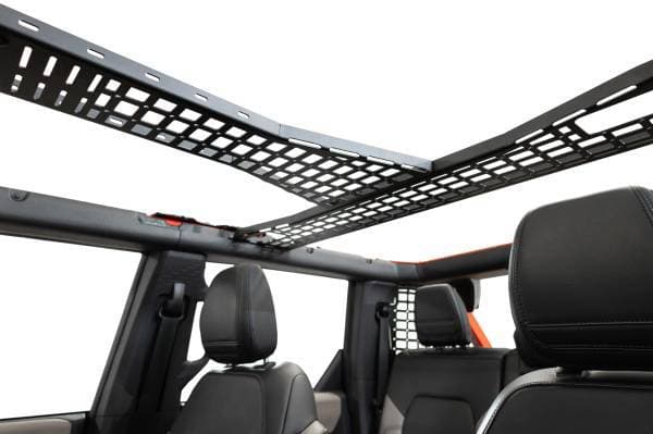 Our Overhead Molle Panels bring versatility to your storage capabilities in the cabin of your Bronco. With one panel spanning between the driver & passenger seats and a perpendicular panel running behind them; your gear is readily accessible while seated. A variety of attachment systems can be used with the molle pattern, including straps, bolts, Quick Fists, and more. These panels are the perfect solution for items like pouches, tools, and digital devices. Its 90 degree radius edges allow you to store items above the panels preventing them from sliding off while turning. The molle conforms to the body lines of the roll bars and provides ample headroom. Strategic cutouts in the molle provide access to the hard top latches, allowing you to remove or install your hard top while the panels are installed. Installation is a straightforward process as these bolt directly to the roll bars. As always, these are made in America.