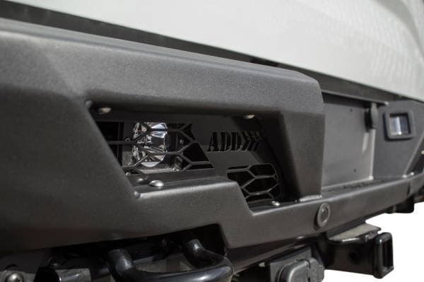 Addictive Desert Designs Stealth Fighter rear bumper is one of the slimmest bumpers you can buy for your Raptor. Measuring the same length from the tailgate as the factory bumper, the Stealth Fighter adds protection to your truck without adding bulk and size. A unique style with sharp angles and recessed paneling follows the factory dovetail look and allows use of factory features such as parking sensors, tow hooks, and hitch. The Stealth Fighter comes standard with two rear face cube light mounts to give your truck additional lighting.