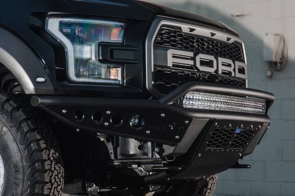 Addictive Desert Designs continues to show why they are a leader in the off-road, aftermarket parts industry. This time, being the first to market with their hand-built, custom, aftermarket front bumpers for the 2017 Ford Raptor. The Stealth R front bumper is form tube made out of .120 wall steel tubing, giving a tight fitment to your Raptor's front end. ADD's universal light mount system on the top of the bumper gives you the option to mount up to 10 Duallys or a 40 in. straight or radius LED bar. To fit your personal tastes, you can mix and match any brand and size lights with the universal light kit to design the exact lighting combination you're looking for. Further lighting options are located behind the side accent panels of the bumper, allowing you to install a 40 in. Rigid Dually on each side. Lights not included. The Stealth R bumper maintains airflow to your intercooler with a vented skid plate. An integrated scoop located behind the skid plate, guides airflow precisely to meet the needs of the 2017 Ford Raptor. With its greater ground clearance and an improved approach angle, the Stealth R bumper is one of the most aggressive off-road bumpers for the 2017 Ford Raptor on the market today.