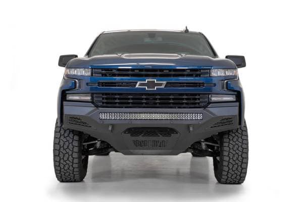 The Chevy Silverado 1500 has never looked better than with the Stealth Fighter front bumper. A radius plate steel design gives your Silverado added front end protection without all the extra bulk. Matching the Chevy 1500 body lines, the Stealth Fighter is a tight fitting bumper that compliments the Silverado's look. Our patented universal light mount system allows mounting up to 10 cube lights or a 40" radius light bar in the center of the bumper. Mount any combination of brand, size, and style light to give your Chevy the added lighting you need. Additional lighting mounts a single cube light behind each side panel. Fully bolt-on means that there is no cutting or welding required to install the Stealth Fighter front bumper. Designed to keep the factory air dams and comes with optional sensor cutouts to retain OEM features. Reinforced D-Ring mounts and optional winch mount provide your truck with added utility to pull through any tough situation.