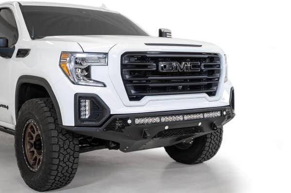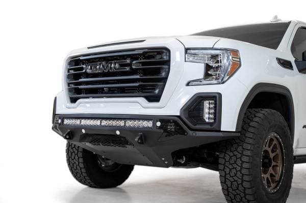 The GMC Sierra 1500 has never looked better with the Stealth Fighter front bumper. A radius plate steel design gives your GMC Sierra added front end protection without all the extra bulk. Matching the GMC 1500 body lines, the Stealth Fighter is a tight fitting bumper that compliments the GMC's look. Our patented universal light mount system allows mounting up to 10 cube lights or a 40 in. radius light bar in the center of the bumper. Mount any combination of brand, size, and style light to give your GMC the added lighting you need. Additional lighting mounts a single cube light behind each side panel. Fully bolt-on means that there is no cutting or welding required to install the Stealth Fighter front bumper. It is designed to keep the factory fog lights and comes with sensor cutouts to retain OEM features. Venting in your skid plate allows proper airflow to the intercooler found on diesel models. Reinforced D-Ring mounts and optional Winch mount provide your truck with added utility to pull through any tough situation.