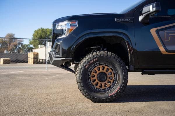 The GMC Sierra 1500 has never looked better with the Stealth Fighter front bumper. A radius plate steel design gives your Sierra added front end protection without all the extra bulk. Matching the GMC 1500 body lines, the Stealth Fighter is a tight fitting bumper that compliments the Sierra's look. Our patented universal light mount system allows mounting up to a 40" radius LED or 10 cube lights in the center of the bumper. Mount any combination of brand, size, and style light to give your GMC the added lighting you need. There is also a mount for one cube light behind each side panel. Fully bolt-on means that there is no cutting or welding required to install the Stealth Fighter front bumper. This design keeps the factory fog lights and comes with optional sensor cutouts to retain your factory parking sensors. Reinforced D-Ring mounts and optional winch mount provide your truck with added utility to pull through any tough situation.