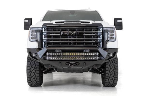 GMC 2500 Bomber HD Front Bumper with Winch with SENSOR CUT OUTS and Dual LED Bar or Round Lights and 3" Cube Mounts on Sides in Hammer Black with Satin Black panels