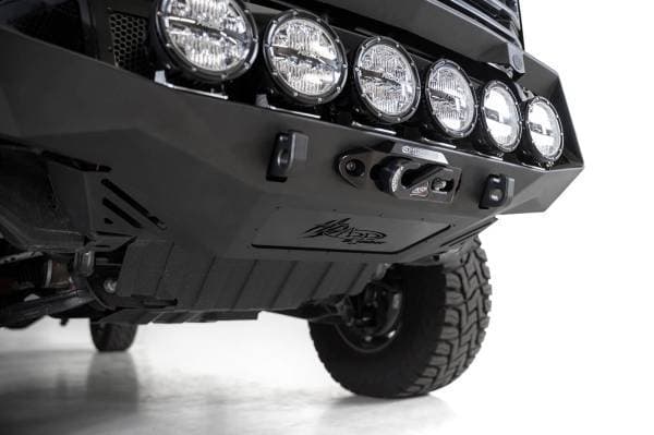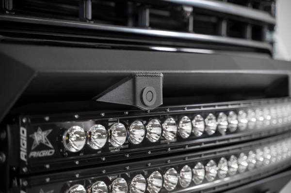 Winch mount; Sensor cutouts; Hammer black powder coat finish; Satin black powder coat panel finish; Mounts for dual light bars or round lights; Mounts for cube lights on sides.