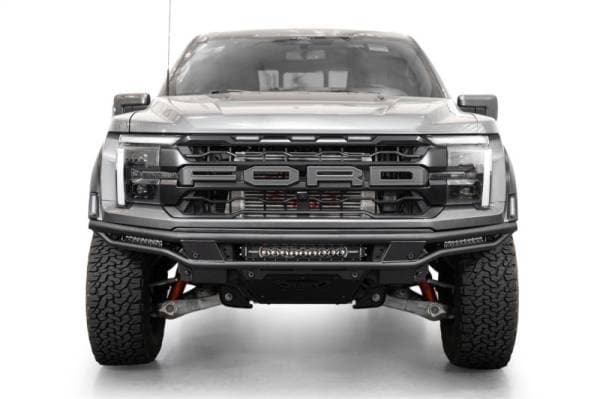 Our Race Series Front Bumper features an aggressive tubular build with a low-profile design inspired by desert racing. The top tube is radiused and closely follows the front body line. With higher clearance you can avoid taller off-road obstacles, especially when traveling at faster speeds. The center dual row 20-inch light bar mount and two side single row 10-inch light bar mounts improve trail lighting when in dark or dusty conditions. Made with American steel, our Front Bumper is designed to both tackle the off-road environment and look great on the streets. The bumper retains the OEM parking sensors, and the adaptive cruise control remains functional with our ACC Relocation Bracket. Finished in a resilient dual-stage hammer black powder coat, our bumper compliments the factory styling of your Raptor. Installation is 100% bolt-on. As always, our front bumper is proudly made in the USA.
