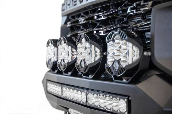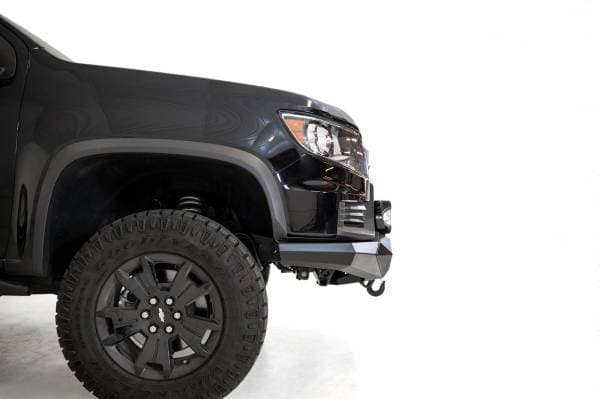 The Stealth Fighter for the Chevy Colorado ZR2 is a low profile front bumper with a radius plate steel design. A 30 in. universal light mount is tucked within the bumper, giving the option to run any 30 in. Radius LED bar or up to 8 cube lights. There are 4 additional mounting points for 6 in. Round Lights along the top of the bumper. A separate mounting plate allows the Winch strength to come straight from the vehicles frame, while reinforced clevis mounts provide a strong point to bolt on 3/4 in. d-rings. The front fascia will need to be cut for OEM removal, but this bumper is otherwise bolt-on. The OEM skid plate can be reused with minor trimming. As always, this bumper is made in America.
