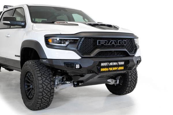 The Addictive Desert Designs Bomber RAM TRX Front Bumper utilizes modern plate steel to bring an aggressive style while still remaining low-profile. The center plate of the bumper features inset mounting points for dual 20 in. light bars, while each side panel provides a cube light mounting point. The factory features of the TRX have been incorporated flawlessly in the TRX front bumper. Accommodations for OEM marker lights and parking sensors are integrated into the bumper design, and the OEM tow hooks remain intact. Addictive Desert Designs leads in the industry in fit and finish and this bumper is no exception. The side wings follow the factory fender lines perfectly and the bumper sits almost flush to the front of the vehicle. A full 3/16 in. aluminum skid plate offers superior front end protection without adding unnecessary weight. As always, this product is fully bolt-on and made in America.