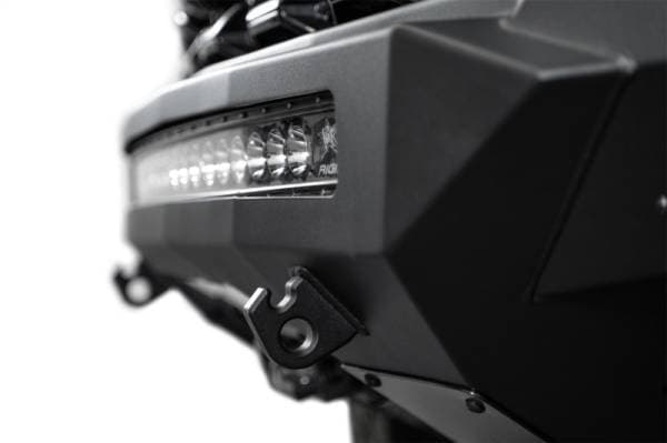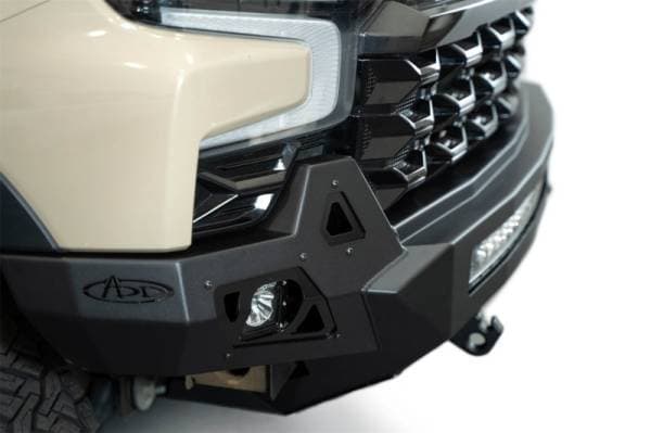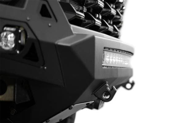 Our Stealth Fighter Front Bumper brings an aggressive style that complements the factory style, and brings additional utility to your truck. The bumper follows the factory body lines with the tightest of tolerances. At the center of the bumper is a light mount that can take a 40-inch radius light bar, or 10 individual 3-inch cube lights. Each wing of the bumper can also mount a 3-inch light pod for even more lighting. An optional extreme duty hidden winch mount is also available. Additional recovery options are provided by 1-inch thick clevis mounts that take ¾-inch D-rings. The satin black skid plate provides protection beneath the front end, and is easily removable if desired. The Stealth Fighter is compatible with adaptive cruise control & retains full functionality of the parking sensors. Finished in a durable hammer black powder coat, this bumper is fully bolt-on and made in the USA from American steel.
