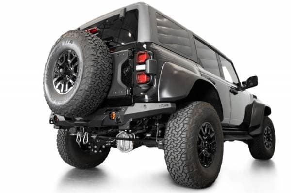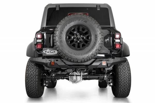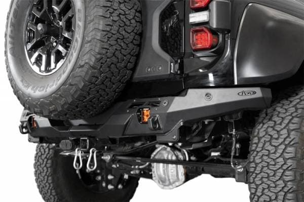 The Phantom Series Rear Bumper features a knife's edge, low-profile design to complement its aggressive stance. OEM features including the parking sensors, hitch, & trailer harness/plug are retained in the design. A license plate bracket is included, which relocates the license plate up and away from the bumper along the tailgate. The factory license plate light is retained, and relocated in this new location. The contours of the Phantom enables you to run a 37-inch spare tire on the factory carrier. 3-inch cube lights can be mounted on each side of the bumper in recessed light mounts for supplemental rear lighting. 1-inch thick clevis mounts that take ¾-inch D-ring shackles provide recovery options if needed. All of our bumpers are finished in a durable dual-stage hammer black powder coat. As always, this is fully bolt-on and Made in America.