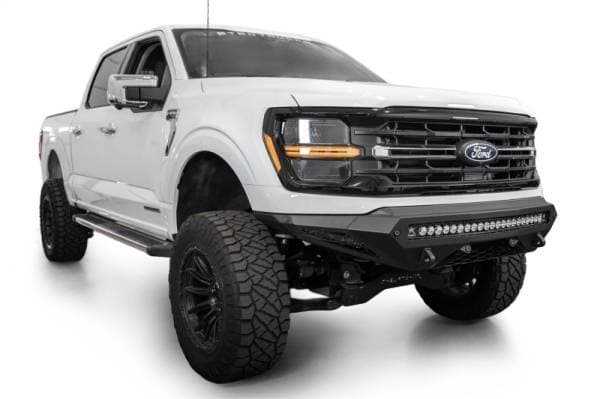Our Stealth Fighter F-150 Front Bumper features a radial design that accentuates your rig's exterior styling. You can utilize the integrated mounts to run a combination of lights to enhance visibility in low-light conditions. The center mount is compatible with either a 40-inch radius light bar or ten cube lights, and the side panel mounts can fit a 10-inch single row light bar or one cube light. The reinforced clevis mounts for soft shackles provide recovery options when caught in those occasional sticky situations. The optional High Flow Performance Intercooler Kit increases air flow to prevent heat soak, improving your truck's engine performance. For those that work hard and play hard, we recommend our Stealth Fighter Winch Front Bumper for maximum vehicle recovery capabilities. The Stealth Fighter includes sensor cutouts maintaining compatibility with both sensor and non-sensor models. The bumper is constructed from durable American steel, and is finished in a dual-stage hammer black powder coat with satin black accent panels for a sleek look. Its fully bolt-on design allows for a stress-free install process. All ADD products are proudly made in the USA.