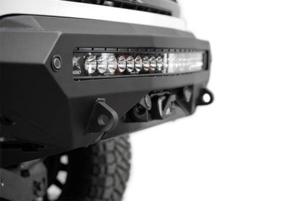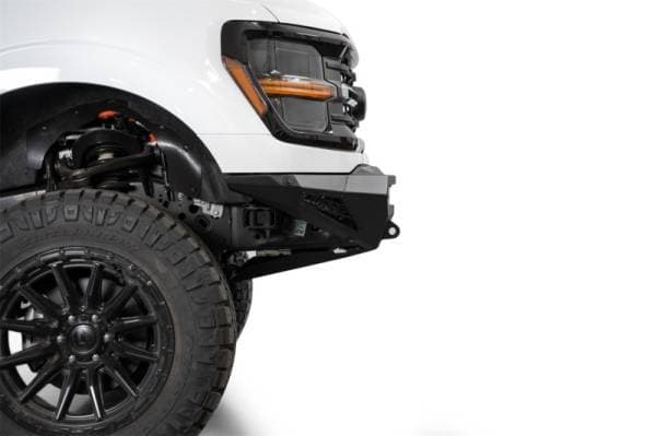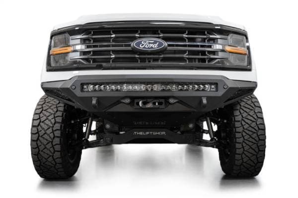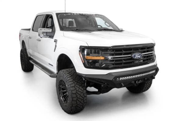 Our Stealth Fighter Winch Front Bumper combines aggressive styling and off-road utility for the ultimate upgrade to your F-150. The heavy-duty winch mount and integrated clevis mounts for soft shackles offer full vehicle recovery capabilities when on the trail. The center mount is designed to run one 40-inch radius light bar or ten cube lights, while each side mount can be fitted with a 10-inch single row light bar or one cube light. This F-150 Front Bumper closely follows the radiused front edge of your truck for elevated styling. Our bumpers are made from American steel, finished in a dual-stage hammer black powder coat finish, and include satin black accent panels for a sleek and durable design. The bumper is compatible with sensor and non-sensor models due to the integrated cutouts. As always, the Stealth Fighter Bumper is fully bolt-on and made in the USA.