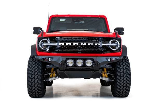 The Bomber is a tight fitting front bumper for the new Bronco, that follows the contours of the body perfectly. At the center of the bumper, is a satin black aluminum panel that frames 3 mounting points for Rigid 360 6-inch lights (also available with Baja Designs Lighting. At the sides of the bumper are mounting points for cube lights, framed by satin black aluminum panels. The Bomber is constructed from modern plate steel, finished in a hammer black powder coat. The aluminum panels are finished in a satin black powder coat. The approach angle of the Bomber is improved over the factory bumper, and provides higher clearance. The OEM parking sensors are incorporated into the design of the bumper. There are 2 heavily reinforced clevis mounts that accept soft shackles for recovery options. We offer an optional 3/16-inch vented aluminum skid plate that provides superior protection over the factory plastic skid plate. An Adaptive Cruise Control Relocation Bracket is also available, which allows you to retain full functionality of the feature. As always, this is fully bolt-on and Made in America.