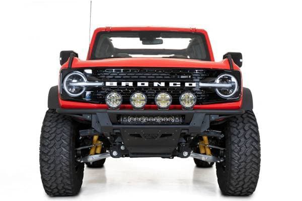 The ADD PRO Bolt-On Front Bumper for the 2021+ Ford Bronco was designed with the lowest profile fitment possible. The upper radius .120-inch wall steel tube follows the contours of the front end, and is joined to steel plating and steel tubing towards the middle. An 1/8-inch vented aluminum skid plate extends towards the undercarriage to provide protection below, and ensures proper airflow to the intercooler. The Pro Bolt-On features universal light mounts that can take a 20-inch LED light bar, or 5 cube lights. Factory parking sensors are integrated into the design and retain full functionality. There is an available ADD PRO Bolt-On Light Hoop for additional lighting. The hoop can mount four 6-inch round lights. Manufactured from the same .120-inch steel wall tubing, the hoop maintains the same low-profile fitment as the rest of the bumper. As always, this bumper is fully bolt-on and Made in America.
