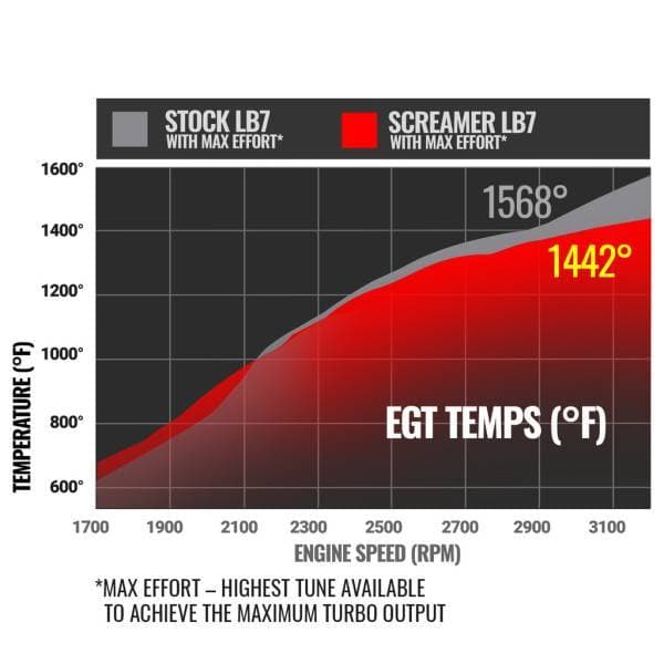 A drop-in, stock-appearing turbo for the Duramax LB7 which utilizes modern-day turbo technology. New compressor and turbine wheels have been designed to give you increased airflow without compromising on low end response. Every turbo has been balanced on a high speed VSR turbo balancer in order to safely increase your boost to 32psi. With supporting modifications, the LB7 Screamer is capable of up to 630hp and works with any "box" tuner.