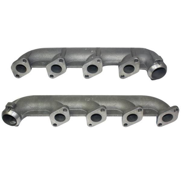 Heavy walled manifolds for improved durability. Manifolds are coated to resist corrosion and are pre-drilled for pyrometer probes. These units replace the old rusted and leaking stock exhaust manifolds that normally require extensive cleaning and machine work to be recovered from warping and distortion. The manifold set comes with both passenger & driver's side units and feed pipe mounting hardware. With the stock manifolds considered a maintenance item due to corrosion and leaking, this set is an excellent preventative replacement item whenever doing other engine work.