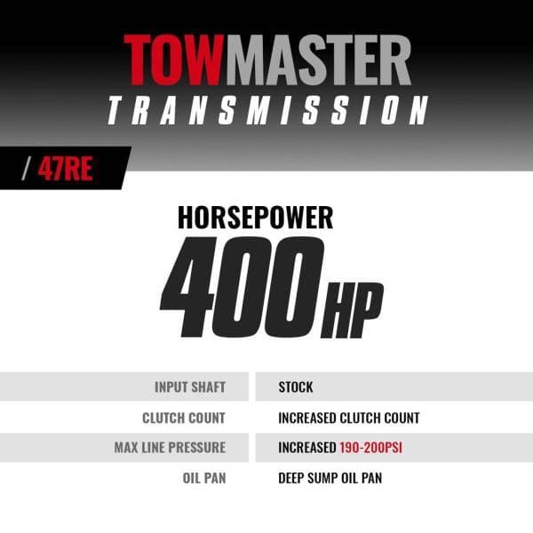 All new bushings; New design valve body; Stock thrust washers replaced with roller Torrington bearings saves governor solenoids and reduces friction; Drilled intermediate shaft for increased lube; Modified manual valve for lube in all positions; 47RE transmissions upgraded with more rugged 48RE components; Clutch Count: OD 6; Clutch Count: OD DIRECT 10; New input shafts and hub; Pan adds 1qt extra oil capacity; Up to 80% higher clutch apply pressures over the stock unit; Pressure increase starts at much lower engine rpm's and at lighter throttle pedal position movement; Light throttle shift firmness is also maintained; No shuttle shifting problems; Upgraded governor pressure transducer (47RE/48RE); Upgraded governor solenoid - Twice the burst pressure than stock; Cooler line case saver in every transmission; Added heavy-duty clutches with up to 25% more material than stock; Machined forward (rear) beveled pressure plate; Machined overdrive brake (front & rear) pressure plate; Machined direct clutch (front) piston; High temp/energy Raybestos band; Billet band strut & anchor; Billet dual ring accumulator piston; BD auxiliary full flow filter kit for extra protection; Clutch Count: FORWARD 5; Clutch Count: DIRECT 5; Fully rollerized geartrain; Increase the durability of your drivetrain; Revised oil circuits; Handles up to 300% more power and torque than the stock transmission; Extra clutches and stronger internals; BD rigid aluminum heavy duty transmission pan; Pan reduces case flex; Pan reduces internal oil leakage; Pan heat-dissipating fins keep temperature down; Pan magnetic drain plug