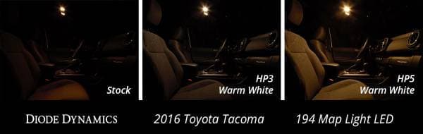 194 HP5 LED Features Diffused lens design for even spread Proven performance highly reliable Increased output with LED Appearance Plug and play simple installation Overview Design. The 194 HP5 LED bulb is a high-power LED in a small package. With copper inserts for heat dissipation the total output far exceeds the original bulb with a single diffused optic to spread light evenly. With its dual-lead contacts it will fit snugly in the socket as a direct plug-and-play replacement. Reliability. Unlike other bulbs on the market this bulb is built with constant-current circuitry along with transient suppression. That means this bulb will last for years not months with no flickering or failure. And like every Diode Dynamics product it's backed by an industry-leading three-year replacement warranty. Brightness. At 92 lumens the HP5 will provide about triple the total light compared to your original 5W 194 or 168 sized bulb. This is quite a lot of light especially if you have multiple bulbs installed. If you're not looking for something this bright we recommend its little brother the HP3. Colors. In addition to vibrant colors of blue red amber and green the 194 HP5 is available in a number of white color options. These include a cool white 6000K warm white 3000K a 5000K or pure white and a 4000K or natural white. Whether you want a modern cool white appearance or a traditional warm white color with more output we have the color to fit your need!