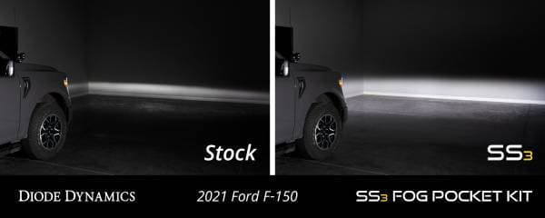 Features Bolt-on fitment compatible with Ford F-150 2021-2023. Adds SAE-compliant fog lights and powerful offroad lighting. Harnesses included for independent control of road-legal and offroad lighting. Backlight feature provides amber accent light. Highly durable powdercoated stainless steel bracket. Engineered and assembled in USA. Overview. The Stage Series Fog Pocket Kit compatible with Ford F-150 2021-2023 from Diode Dynamics allows you to mount four SS3 LED Pods in the factory bumper openings. This kit adds some serious functionality to your Bronco with both road-legal fog lights and powerful offroad lighting. This kit includes application-specific brackets that were CAD-designed to install using factory mounting points. No cutting or drilling required! Lighting for Every Situation. This kit includes two SS3 LED Pods in the SAE-compliant fog beam pattern and two SS3 LED pods in the combo beam pattern. This combination gives you different options whether you are on or offroad. All options use high-intensity LED emitters and TIR optics for unmatched focus and overall output. Independent Control.With the included harness and adapters the two SS3 Fog pods and two SS3 offroad pods in this kit can be controlled independently allowing you to switch between road-legal fog lights and offroad lights with ease. The included H10-size or Molex adapters connect the SS3 fog pods to your factory halogen or LED fog light connecter while the off-road lights in this kit are controlled with either the included 3-way toggle switch or a factory-installed aux switch. SAE Compliant. When installed as a pair and aimed in accordance with your state's regulations the Fog pattern meets SAE J583 standard as a Foglamp for legal on-road use.