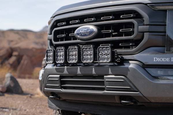 The Grille CrossLink Lightbar Kit compatible with Ford F-150 2021+ from Diode Dynamics allows you to mount five linked SS5 LED pods on the factory grille.