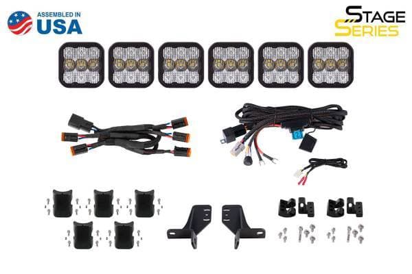 Included in the box: Two (2) Application-specific heavy-duty steel brackets. Six (6) Stage Series 5inch LED Pods. Five (5) CrossLinks with hardware. One (1) CrossLink endmount kit. Four (4) Ultra heavy duty crosslink splitter harness. One (1) Ultra heavy duty terminating splitter harness. One (1) Ultra heavy-duty single-output harness. Installation Guide.
