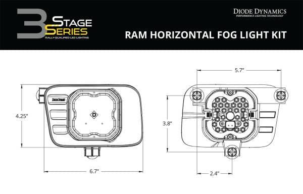 Features Advanced TIR optics provide high efficiency and focus SAE-compliant road-legal output Includes round bezel, for factory-style appearance Plug and play, no modification needed Durable powdercoated aluminum extrusion Engineered and Assembled in USA Overview Overview. Upgrade your fog lights with our SS3 Ram Horizontal Fog Light Bracket Kit! Featuring higher output intensity than any other 3in light on the market, these LED pods have been designed for maximum functionality, with custom-engineered TIR optics shining in highly useful beam patterns, all in a durable package. With the included round bezel, the SS3 Fog Kit has a clean, factory-style appearance, only much brighter! Plug and Play. Thanks to custom-molded brackets, the SS3 Fog Light Bracket Kit can be installed on your vehicle in minutes. Simply remove your factory fog light assembly and ours will bolt right in its place! Wire adapters are included with the kit, allowing you to connect the lights to your factory bulb sockets - no additional wiring needed! Backlight Functionality. The Stage Series 3in LED Pod is now available with a distinctive backlight, in a brilliant amber color. The SS3's backlight fully illuminates the TIR optic, providing a more unique and modern look than the small indicator LEDs found in other products. SAE Compliant. When installed as a pair and aimed in accordance with your state's regulations the Driving White pattern meets SAE J581 standard as a Driving/Auxiliary High Beam Light and the Fog pattern meets SAE J583 standard as a Foglamp for legal on-road use.