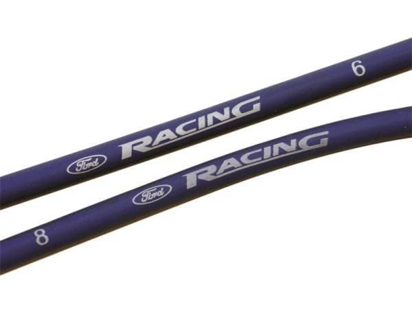 These 9mm wires feature a spiral-wound suppression core for low resistance and minimum spark loss. They have tough silicone insulation to withstand high temperatures and voltage loss for minimum crossfire, and are highly resistant to fuels, oils, and solvents. Other features include 45 degree plug boots (most applications), stainless steel distributor cap terminals, and a coil wire (if applicable). The wires are numbered for each cylinder and have the 'Ford Racing' script on them.