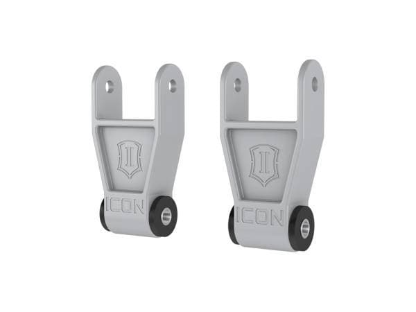 Fine tune the rear ride height on your 2010-2025 Ford F-150 with ICON Vehicle Dynamics’ Billet Aluminum Lowering Shackle Kit. CNC machined from 6061 aviation grade aluminum; these billet shackles offer increased strength compared to the thin steel of the stock units to better withstand the stresses of aggressive off-road use. Their increased length also lowers the rear ride height of the truck by 1”, requiring less front lift to achieve a level stance or to assist in rear ride height tuning with aftermarket leaf springs. Their gusseted design ensures proper bushing clearance to allow fitment for stock leaf springs, ICON F-150 Multi-Rate Leaf Springs, and most other aftermarket spring packs for a wide range of suspension setup options. Pre-installed, replaceable, press in OE Ford bonded bushings make for an easy install, require no periodic greasing, and offer noise free operation while still cycling full suspension travel. The shackles look as great as they perform with a satin gray anodized finish.
