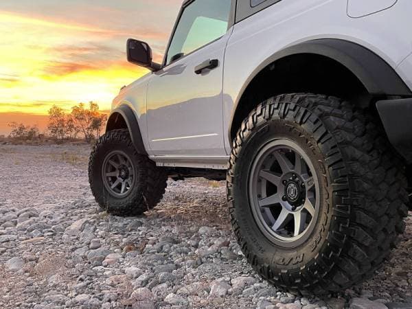 The ICON 2021-2023 Fords Bronco 3" Lift Coilover Spacer Kit utilizes a combination of coil spring preload spacers and top load shims to yield 3” of lift in the front and 2” of rear lift for models equipped with the HOSS 2.0 suspension package, or up to 2.75” of lift in the rear for HOSS 1.0 equipped Broncos. Taking the front-end geometry of the Bronco into account, this kit is designed to provide lift while ensuring that here is no ball joint over extension or bind that can cause damage to ball joints. CNC machined 6061 billet aluminum construction and a black anodized finish mean this product can stand up to the test of time in the harshest on and off-road conditions. Backed by ICON’s limited lifetime warranty, the ICON Vehicle Dynamics 3" Lift Coilover Spacer Kit is the best leveling solution on the market for the 2021-2023 Ford Bronco.