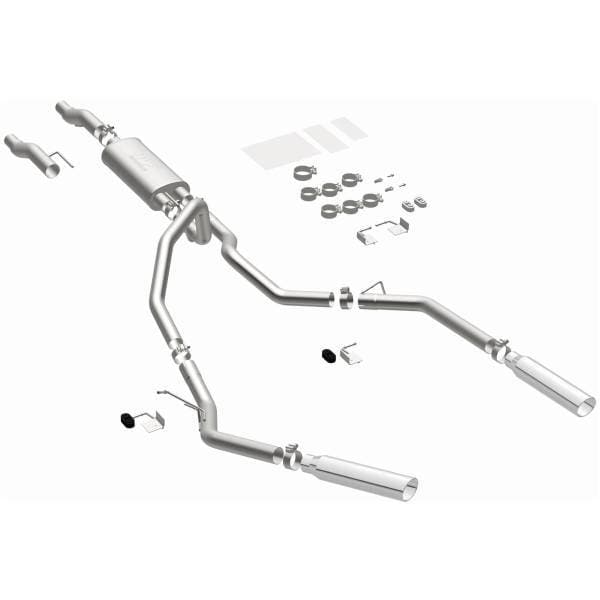 The MagnaFlow 2011-2014 Ford F-150 Street Series Cat-Back Performance Exhaust System 15460 brings out the personality of your 3.7L, 5.0L, 6.2L 2011-2014 Ford F-150 with our signature resonant, powerful engine tone and dyno-proven performance. Thanks to its fast-flowing, mandrel bent 3in. main piping and 1 Straight-Through mufflers ending in a Dual Split Rear exit with 3.5in. Polished Clamp-On Single Wall Angle Cut Rolled Edge tips, this Ford F-150 exhaust kit has the performance chops to match its sporty sound and appearance. Upgrade your ride to the next level with an exhaust that has the pipes to put other Ford F-150's to shame. With this system your vehicle will be producing Aggressive exterior and Moderate interior sound levels while leaving other cars and trucks feeling envious at every stoplight. Exhaust kit 15460 features a cat-back layout that replaces your ride's stock exhaust components from near the catalytic converter on back. Extensive 3D scanning during development has resulted in a direct-fit design that you can easily install yourself. 15460 is produced using CNC precision robotic manufacturing techniques and is backed by MagnaFlow's 1-year limited finish warranty and limited lifetime construction warranty.