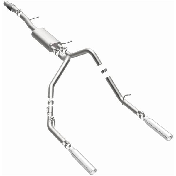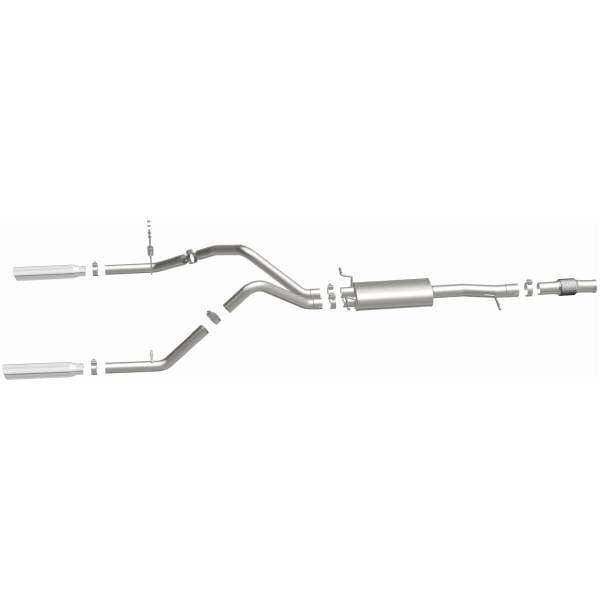 The MagnaFlow Street Series Cat-Back Performance Exhaust System 15278 brings out the personality of your Truck with our signature resonant, powerful engine tone and dyno-proven performance. Thanks to its fast-flowing, mandrel bent 3in. main piping and 1 Straight-Through mufflers ending in a Dual Split Rear exit with 3.5in. Polished Clamp-On Single Wall Angle Cut Rolled Edge tips, this Truck exhaust kit has the performance chops to match its sporty sound and appearance. Upgrade your ride to the next level with an exhaust that has the pipes to put other Truck's to shame. With this system your vehicle will be producing Aggressive exterior and Moderate interior sound levels while leaving other cars and trucks feeling envious at every stoplight. Exhaust kit 15278 features a cat-back layout that replaces your ride's stock exhaust components from near the catalytic converter on back. Extensive 3D scanning during development has resulted in a direct-fit design that you can easily install yourself. 15278 is produced using CNC precision robotic manufacturing techniques and is backed by MagnaFlow's 1-year limited finish warranty and limited lifetime construction warranty.