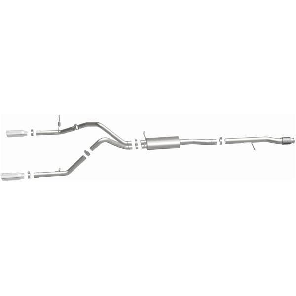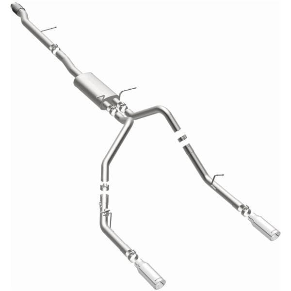 The MagnaFlow Street Series Cat-Back Performance Exhaust System 15268 brings out the personality of your Truck with our signature resonant, powerful engine tone and dyno-proven performance. Thanks to its fast-flowing, mandrel bent 3in. main piping and 1 Straight-Through mufflers ending in a Dual Split Rear exit with 4in. Polished Clamp-On Double Wall Angle Cut Rolled Edge tips, this Truck exhaust kit has the performance chops to match its sporty sound and appearance. Upgrade your ride to the next level with an exhaust that has the pipes to put other Truck's to shame. With this system your vehicle will be producing Aggressive exterior and Moderate interior sound levels while leaving other cars and trucks feeling envious at every stoplight. Exhaust kit 15268 features a cat-back layout that replaces your ride's stock exhaust components from near the catalytic converter on back. Extensive 3D scanning during development has resulted in a direct-fit design that you can easily install yourself. 15268 is produced using CNC precision robotic manufacturing techniques and is backed by MagnaFlow's 1-year limited finish warranty and limited lifetime construction warranty.