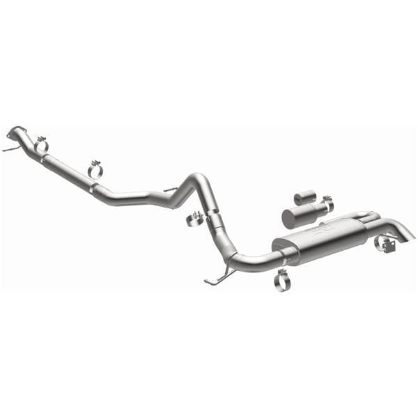 The MagnaFlow Ford Bronco Overland Series Cat-Back Performance Exhaust system #19559 is the perfect solution to further improve the off-road utility of your already-capable 2021-2023 Ford Bronco equipped with the 2.7L twin-turbo V6. This cat-back, direct-fit exhaust kit is designed to install easily and fit perfectly thanks to the hard work of the engineers at MagnaFlow's Tech Center, who made detailed 3D scans of the entire vehicle in order to ensure perfect fitment. The advantage of such precise tolerances is that the entire performance exhaust system is mounted closer to the undercarriage of the vehicle than the stock system, resulting in significantly improved ground clearance. #19559 also features 3" main piping that leads to a straight-through muffler before terminating in a single 2.5" high-clearance side exit, which further improves the rear departure angle versus the standard tailpipe. The result of this upgrade is improved rock crawling capability and the ability to get out of tricky situations on the trail more easily. This Ford Bronco exhaust system utilizes a tunable NDT (No Drone Technology) quarter-wave resonator to eliminate unwanted noises at cruising speeds en route to your destination, with the added benefit of improving situational awareness when you're out exploring or camping in the middle of nowhere. Exhaust kit #19559 is engineered to produce MagnaFlow's deep signature exhaust tone at mild interior and moderate exterior sound levels, ideal for enjoying the character of your engine without scaring Mother Nature away. The exhaust system is built to last thanks to the use of precision CNC robotic manufacturing techniques and durable stainless-steel construction, all backed by MagnaFlow's limited lifetime warranty.
