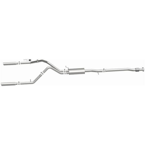 The MagnaFlow Street Series Cat-Back Performance Exhaust System 16741 brings out the personality of your Truck with our signature resonant, powerful engine tone and dyno-proven performance. Thanks to its fast-flowing, mandrel bent 3in. main piping and 1 Straight-Through mufflers ending in a Dual Split Rear exit with 3.5in. Polished Clamp-On Single Wall Angle Cut Rolled Edge tips, this Truck exhaust kit has the performance chops to match its sporty sound and appearance. Upgrade your ride to the next level with an exhaust that has the pipes to put other Truck's to shame. With this system your vehicle will be producing Aggressive exterior and Moderate interior sound levels while leaving other cars and trucks feeling envious at every stoplight. Exhaust kit 16741 features a cat-back layout that replaces your ride's stock exhaust components from near the catalytic converter on back. Extensive 3D scanning during development has resulted in a direct-fit design that you can easily install yourself. 16741 is produced using CNC precision robotic manufacturing techniques and is backed by MagnaFlow's 1-year limited finish warranty and limited lifetime construction warranty.