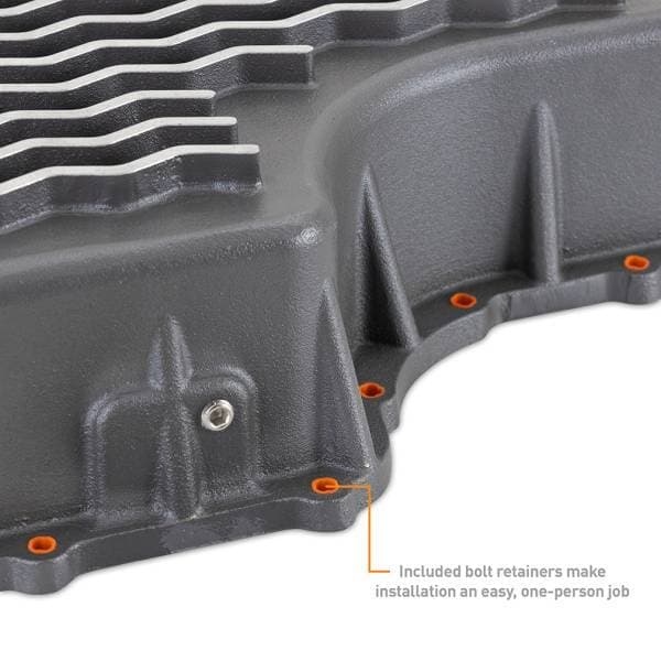 This Mishimoto Aluminum Transmission Pan is a direct-fit, high-performance upgrade for your 2011-2019 Ford 6.7L Powerstroke. Cast from high-quality aluminum and powder coated Gunmetal Gray, our transmission pan is a robust and long-lasting upgrade for your vehicle's transmission. With a sleek design and bottom ribs, this pan not only adds to the overall aesthetic of your truck but also provides improved cooling performance.----This transmission pan features internal baffles that reduce sloshing and enhance heat dissipation, resulting in smoother transmission performance. All the headaches that come with a flat gasket and messy sealants are eliminated with our precision-machined dovetail-style groove and O-ring seal. This groove positively retains the O-ring, so you never have to worry about it falling out of place during installation. Additionally, the Mishimoto 2011-2019 Ford 6.7L Powerstroke Aluminum Transmission Pan adds an extra 5.9 quarts of ATF to help maintain optimal transmission operation.----Fed up with the frustration of trying to hold up a transmission pan with one hand while threading the fasteners in with the other? Mishimoto has you covered with pre-installed bolt retainers that hold the fasteners in the pan, allowing you to easily thread the bolts without dropping them on the ground, your head, or worse, that pan of nasty transmission fluid you just drained. Additionally, our pan comes equipped with a magnetic drain plug for easy draining and a 1/8-inch NPT port and plug for temperature sensors to make servicing your transmission and monitoring temperatures a breeze.----This direct-fit upgrade offers affordable durability and helps maintain smooth transmission operation, ensuring a long life for your transmission. Like all Mishimoto products, this transmission pan is backed by the Mishimoto Lifetime Warranty.