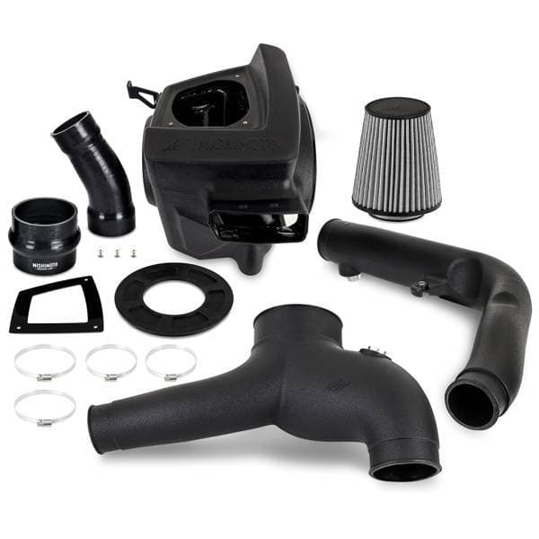 The goal of any well-designed intake system is to provide your engine with as much cool, clean air as possible. This is especially important when you're cramming air into the engine with a turbocharger (or two). Access to cold and clean air becomes increasingly difficult, however, when you're bombing dusty trails or muddy bogs in the summer heat with your Bronco. Luckily, Mishimoto and Borne Off-Road have the complete solution to keep cool, clean air flowing through the 2.7L EcoBoost in your 2021+ Ford Bronco. This snorkel and intake package for your 2021+ Ford Bronco ensures your engine can breathe in cool, clean air no matter where you are.----The Borne Off-Road snorkel moves the fresh air inlet to roof height, allowing the engine to draw in cleaner air on the trail. Our precision rotational-molded tube is made from durable, UV-resistant cross-linked polyethylene that can withstand the heat of the sun and any debris the trail can throw at it. The top of our snorkel includes a 6-inch inlet with a steel mesh cover to protect the intake from large debris. This inlet can also be swapped for a pre-filter to help keep your main intake filter clean.----After the snorkel finds the clean air, the Mishimoto intake takes over to clean it further and add power. The Mishimoto performance intake utilizes a 4.5-in high-flow filter which, combined with the rotomolded construction, results in an intake that is 39.6% less restrictive than stock. That increase in flow yields power gains of 7.5 HP and 7.4 lb.-ft of torque. To protect your high-flow filter through any terrain, we've also included a fresh-air intake block-off that can be removed for better flow when not on the trail.----Combined, these two intake components let your 2021+ Ford Bronco 2.7L EcoBoost breathe freely on any trail or street. Like all our products, this intake bundle is backed by our Mishimoto Lifetime Warranty.