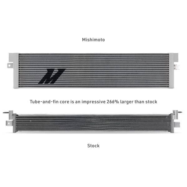 Mishimoto’s direct-fit transmission cooler is engineered with a significantly larger tube and fin core that is 266% bigger than stock and maximizes cooling efficiency. This larger capacity reduces transmission temperatures and stress, helping extend the life of your transmission while maintaining reliable operation under heavy loads. Sturdy internal strutted tubes offer greater pressure resistance and protection against chassis flex.
